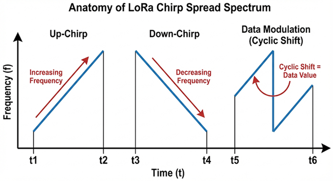 - Chirp Spread Spectrum (CSS): Informationen werden auf „Chirps“ (frequenzmodulierte Impulse) moduliert.