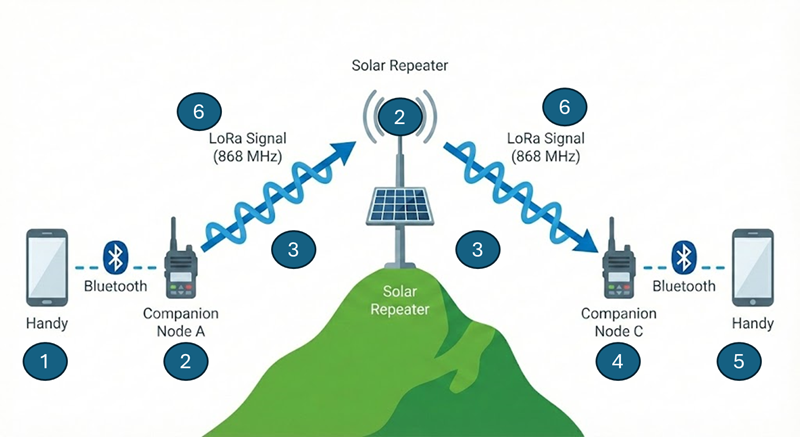 Der zweite Teil beschäftigt sich mit dem technischen Versand einer Nachricht, oder anders ausgedrückt, was passiert zwischen einem Companion-Node als Sender, einem Repeater und einem Companion-Node, der die Nachricht empfängt.