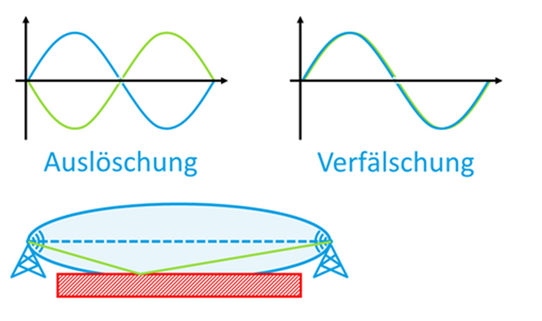 Das Funksignal breitet sich als Welle aus. Wenn ein Teil der Welle auf ein Hindernis (z. B. eine Hauskante oder den Boden) innerhalb der Fresnel-Zone trifft: