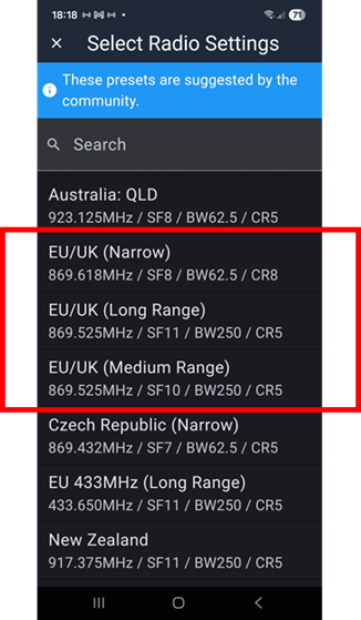 In der Bluetooth App finden sich unter den Einstellungen die Presets, die aktuell ausgewählt werden können. Mit Stand Februar 2026 wird in Deutschland EU/UK (Narrow) am häufigsten verwendet.