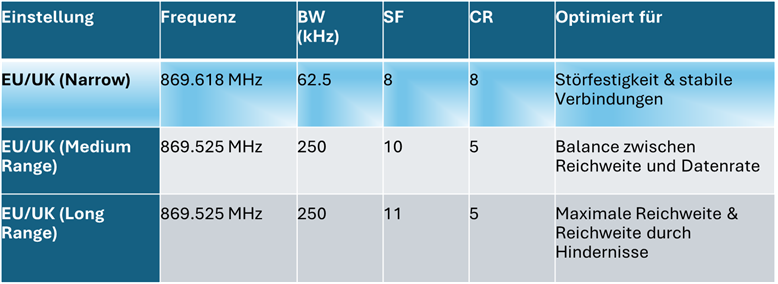In der Tabelle sind die für Deutschland üblichen Einstellungen mit den vordefinierten Parametern abgebildet. Bei uns ist nur die Frequenz 869 MHZ erlaubt.