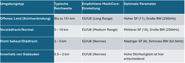 LoRa-Einstellungsempfehlungen nach Umgebung.