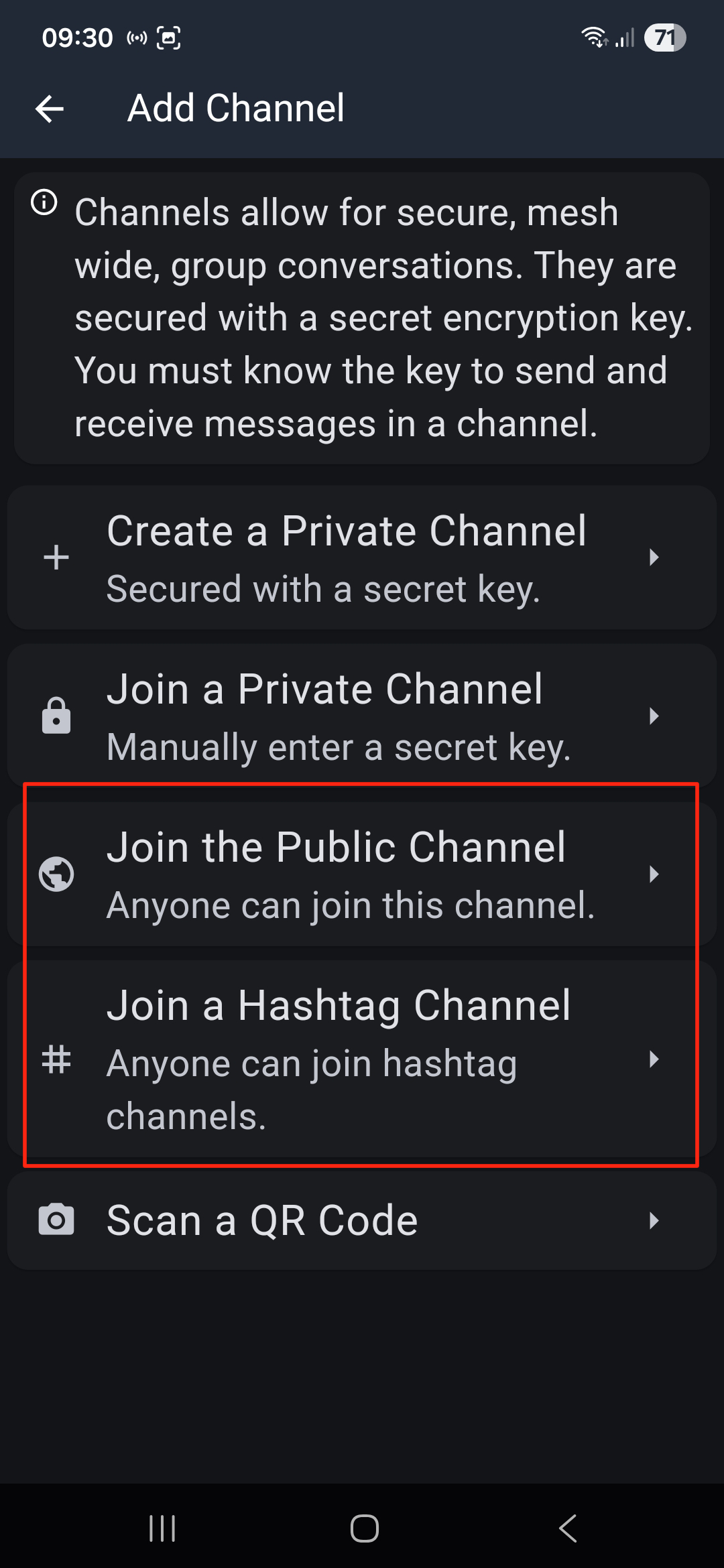 Private Kanäle: Um einem existierenden privaten beizutreten, musst du den Secret Key von der Person erhalten, die den Kanal erstellt hat. Der Ersteller kann dir den Key entweder als Textfolge schicken oder du scannst einen generierten QR-Code direkt von dessen Handy ab.
