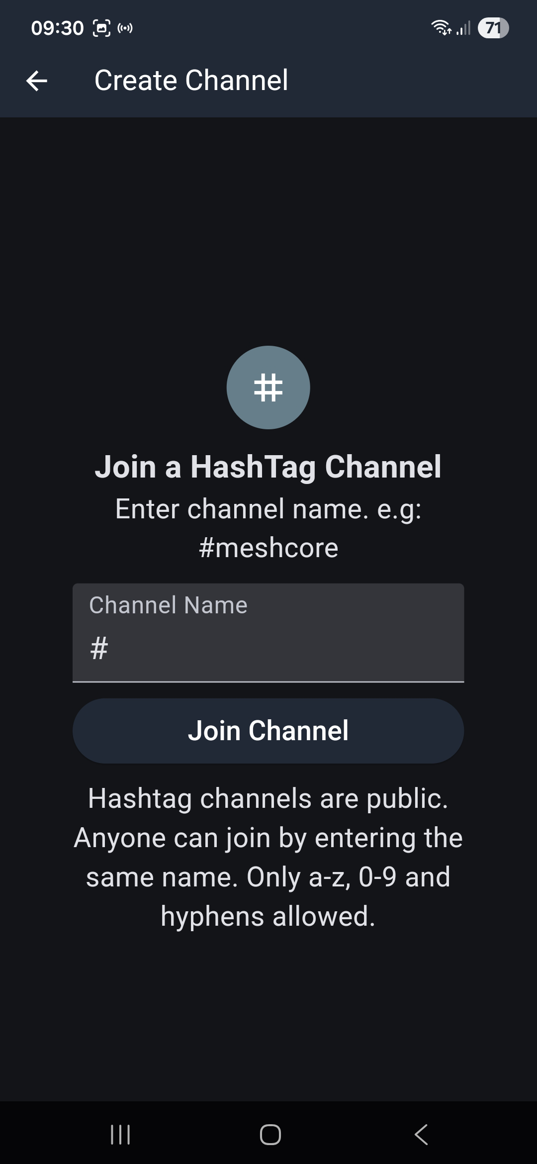 Eigene Kanäle können in der App erstellt werden, erfordern dann aber den Austausch des geteilten Schlüssels mit anderen Nutzen von Meshcore, ansonsten bleibt man alleine in seinem #Kanal.